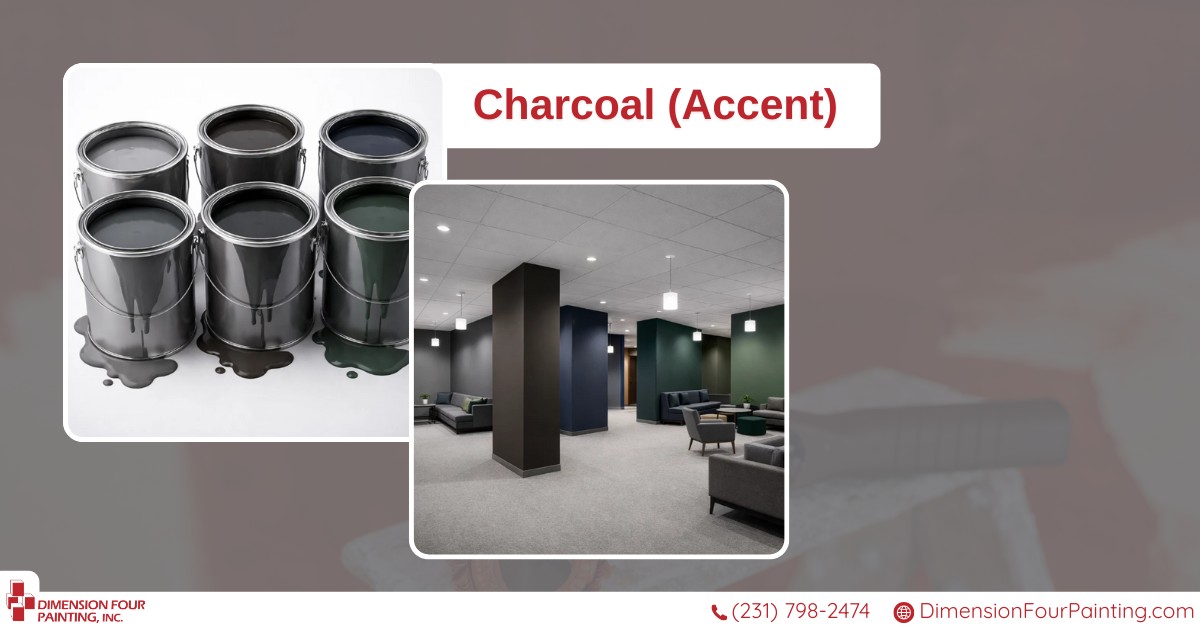 Rather than covering entire rooms, charcoal is best used as an accent color in 2026. When applied strategically, it adds contrast, improves wayfinding, and reinforces brand identity without darkening the space.
